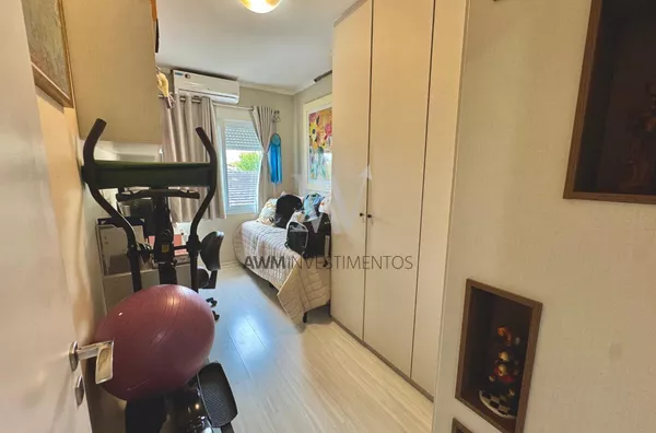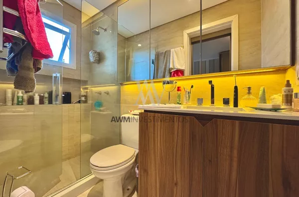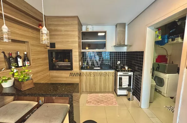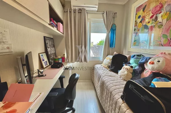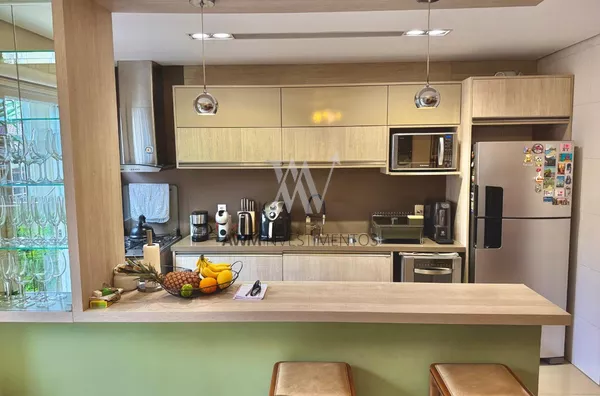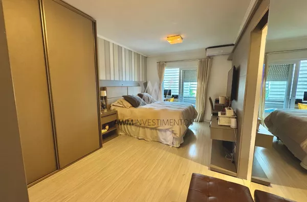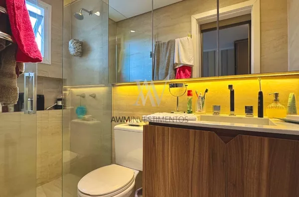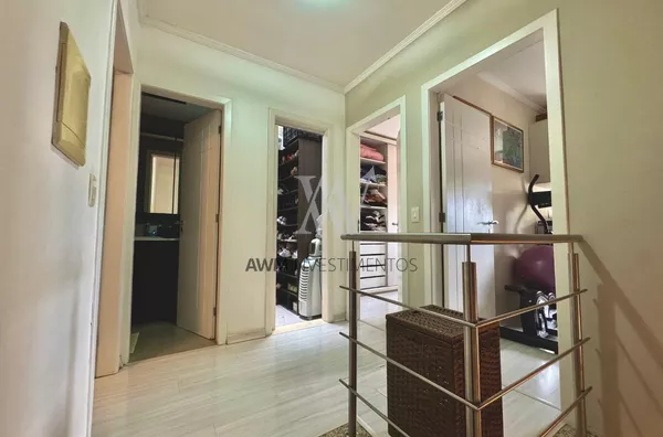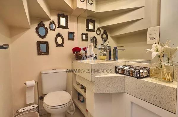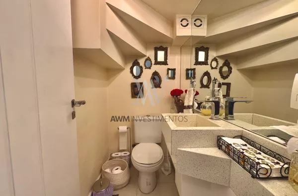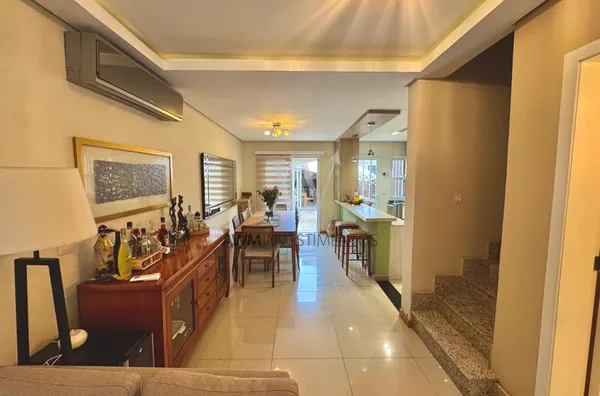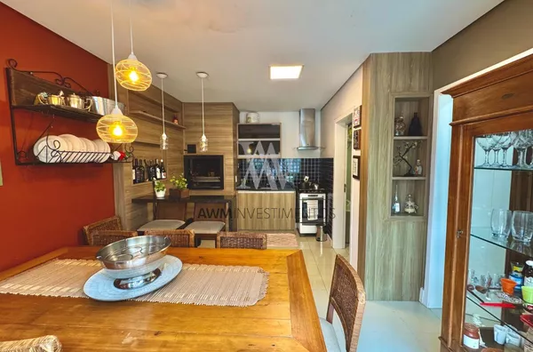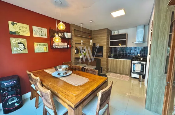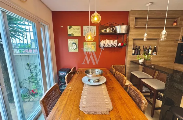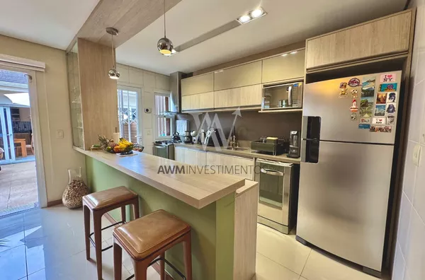 Awm Vende com três dormitórios, sendo uma suíte ampla com espaço extra transformado em home office perfeito para quem trabalha de casa ou precisa de um cantinho de concentração. No térreo, os ambientes são integrados, oferecendo living com lareira, sala de jantar, lavabo e cozinha planejada com móveis Finger, que valorizam o uso inteligente do espaço.