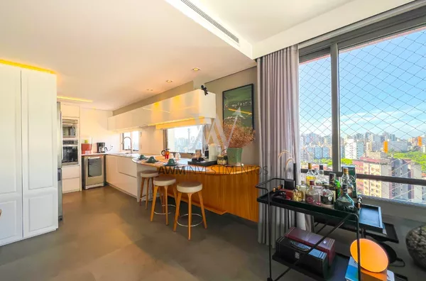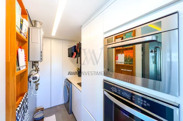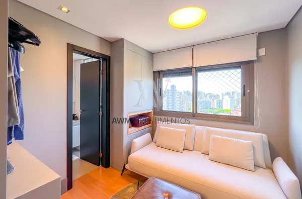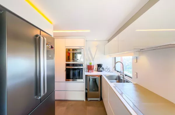 O living é espaçoso, ideal para dois ambientes, e conta com uma aconchegante lareira, criando uma atmosfera acolhedora. O imóvel ainda dispõe de lavabo e uma cozinha americana integrada ao living, permitindo maior fluidez entre os espaços. A área de serviço é separada, garantindo mais privacidade e funcionalidade. O imóvel também conta com 3 vagas de garagem individuais, oferecendo praticidade e segurança. O projeto arquitetônico foi desenvolvido pelo renomado escritório Stemmer Rodrigues, que cuidou de cada detalhe para criar um ambiente sofisticado e bem planejado.