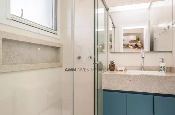 Amw Vende, Apartamento de 1 dormitório, semi mobiliado, 57m² privativos, living amplo com teto rebaixado em gesso, cozinha com churrasqueira, área de serviços individual e 1 vaga para veículo.