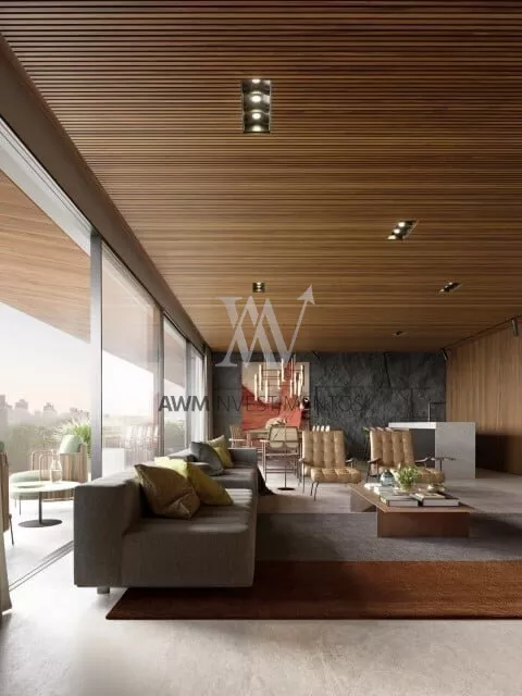 Fachada ventilada com acabamento em ACM e textura amadeirada;