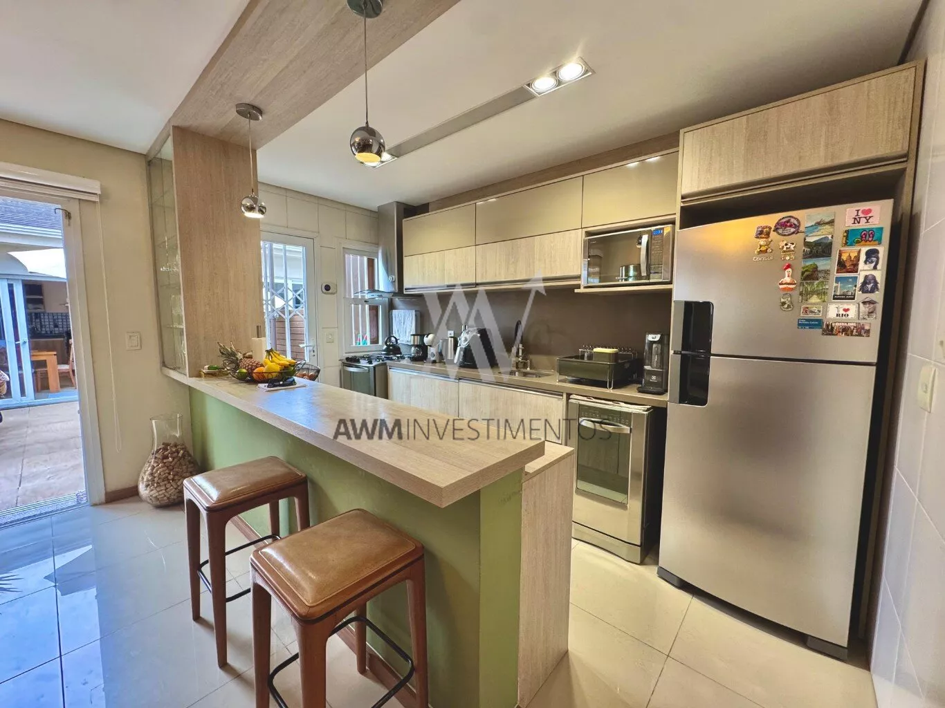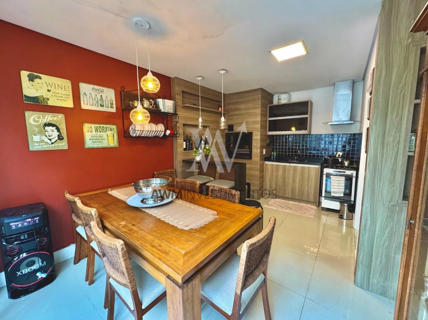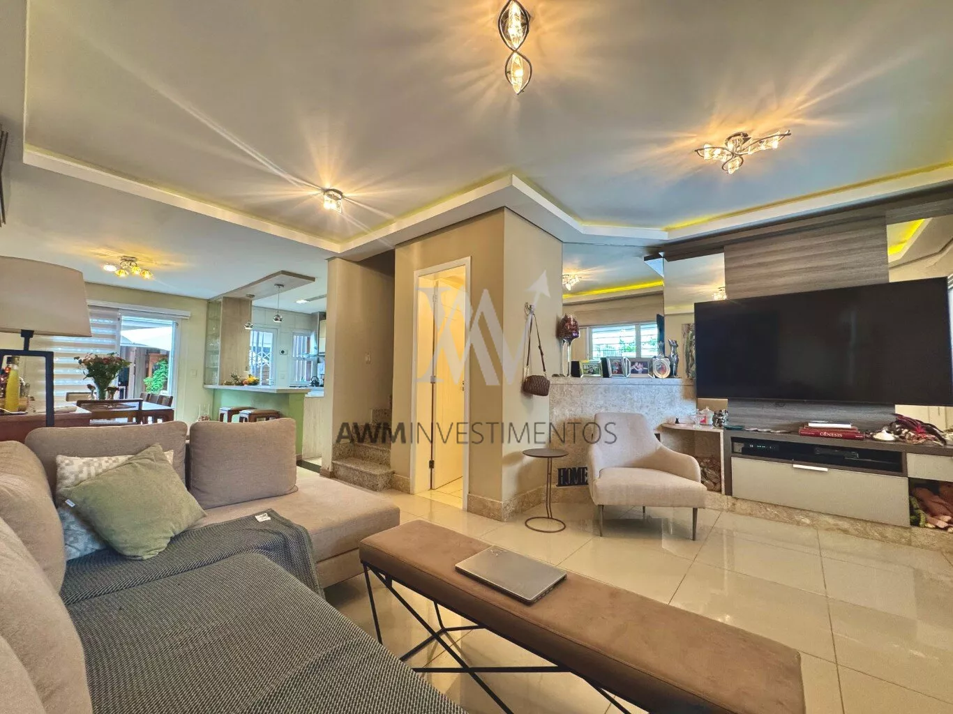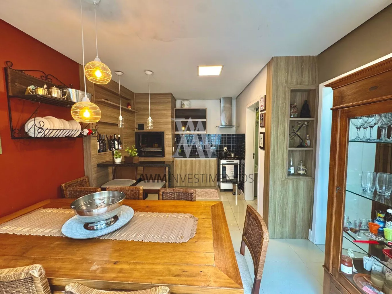 Awm Vende com três dormitórios, sendo uma suíte ampla com espaço extra transformado em home office perfeito para quem trabalha de casa ou precisa de um cantinho de concentração. No térreo, os ambientes são integrados, oferecendo living com lareira, sala de jantar, lavabo e cozinha planejada com móveis Finger, que valorizam o uso inteligente do espaço.