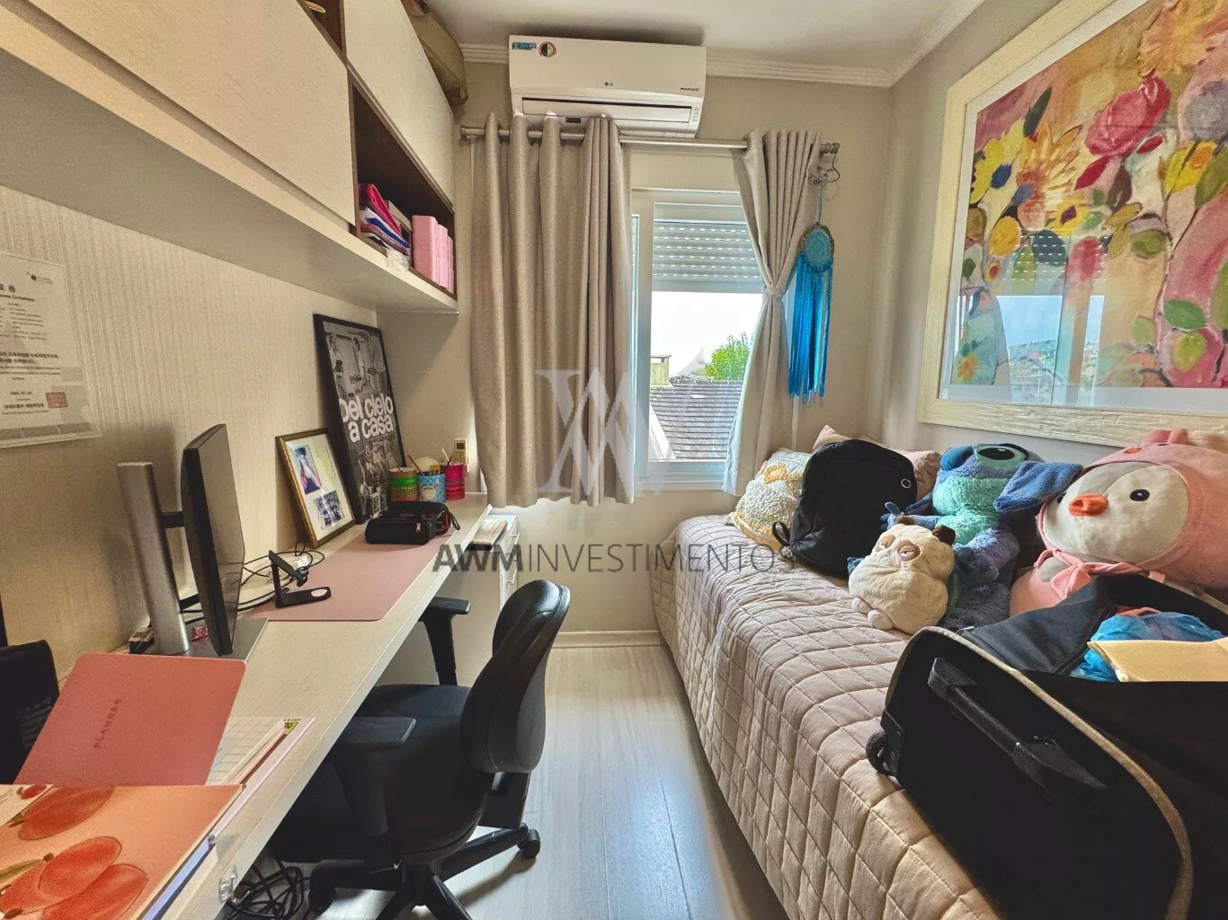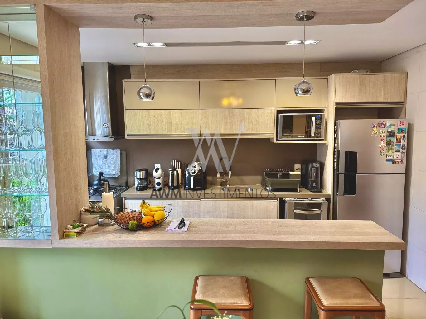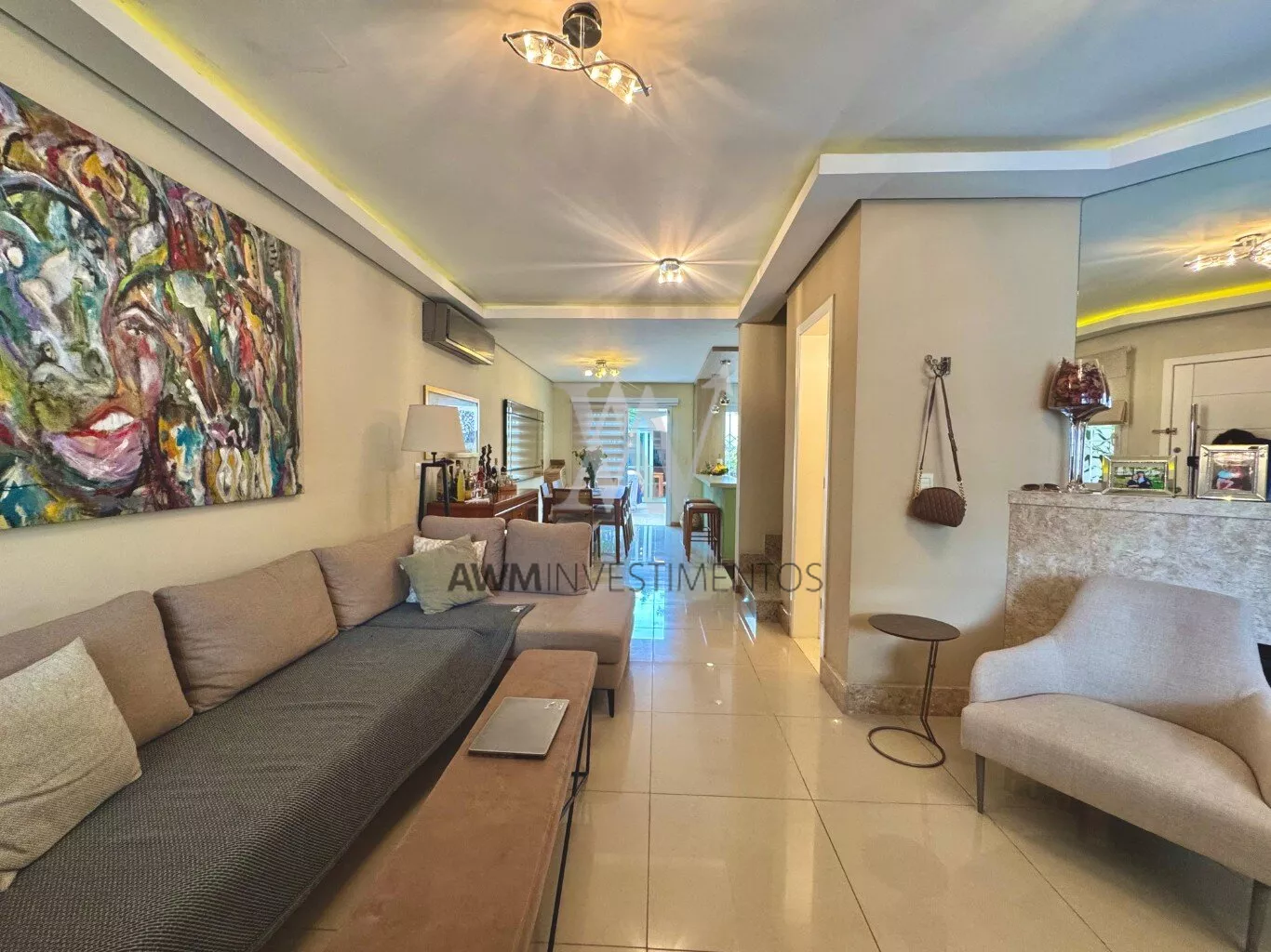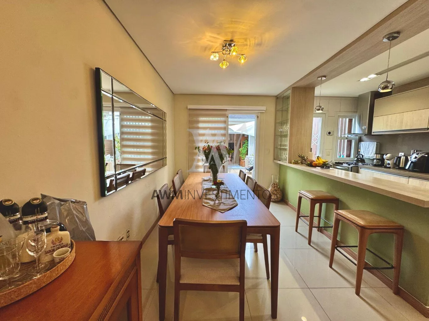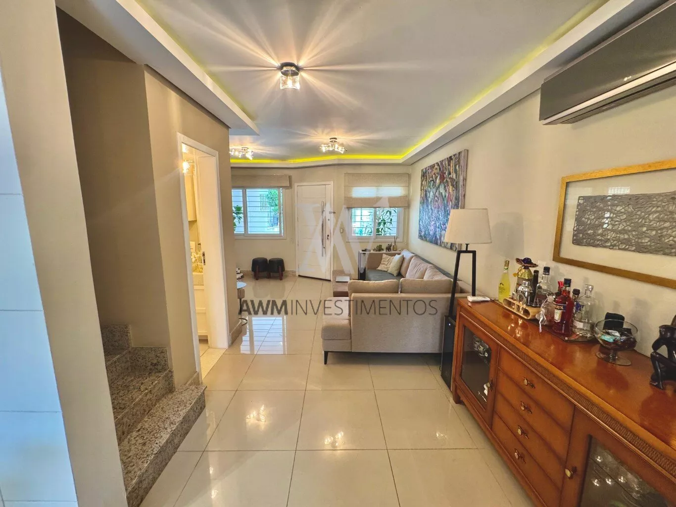 Awm Vende com três dormitórios, sendo uma suíte ampla com espaço extra transformado em home office perfeito para quem trabalha de casa ou precisa de um cantinho de concentração. No térreo, os ambientes são integrados, oferecendo living com lareira, sala de jantar, lavabo e cozinha planejada com móveis Finger, que valorizam o uso inteligente do espaço.