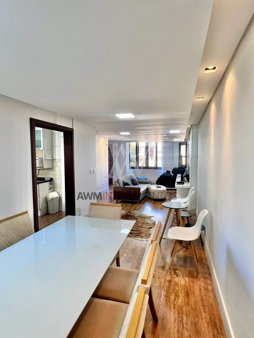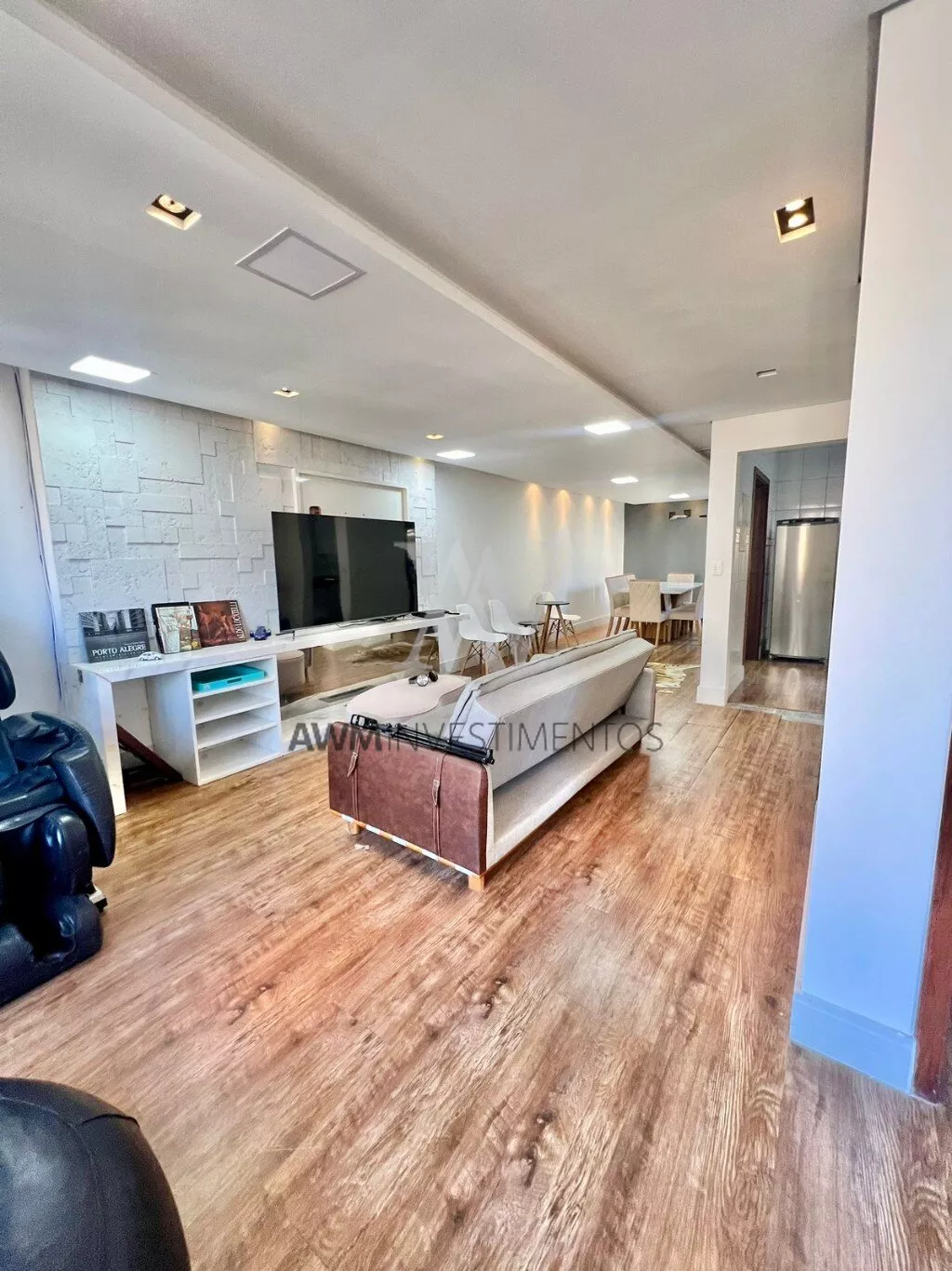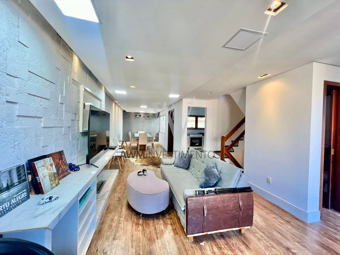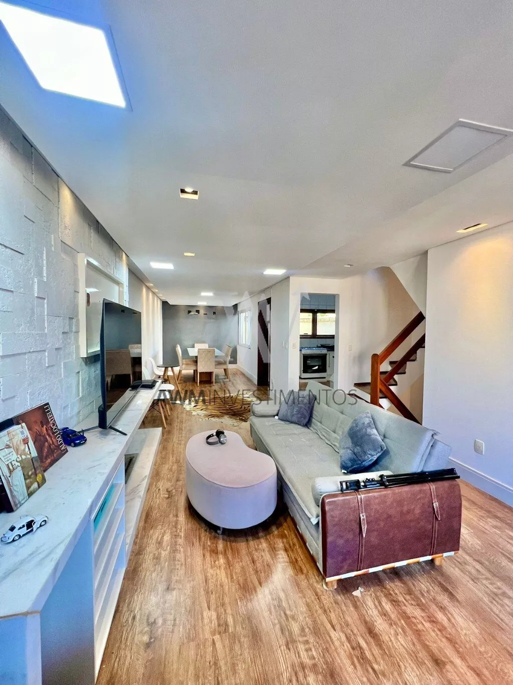 No segundo piso temos um lavabo, uma sala com 3 ambientes, lareira ecológica e um lindo painel com mármore branco, 1 cozinha planejada com móveis.