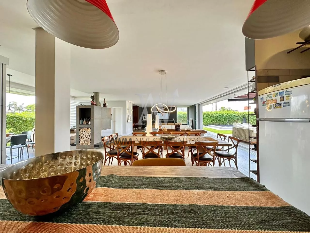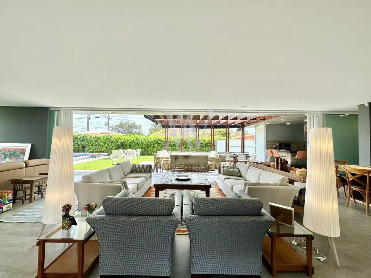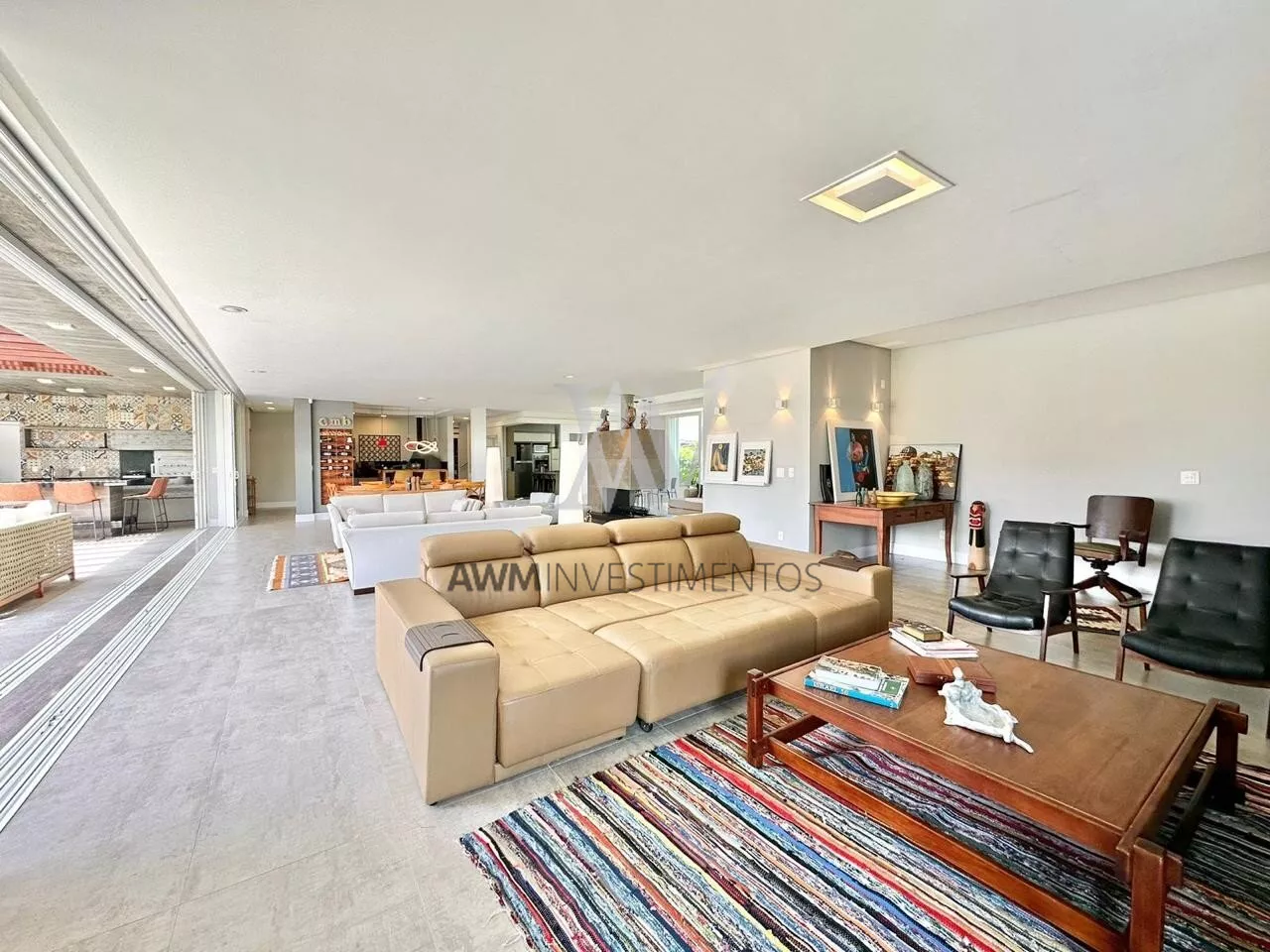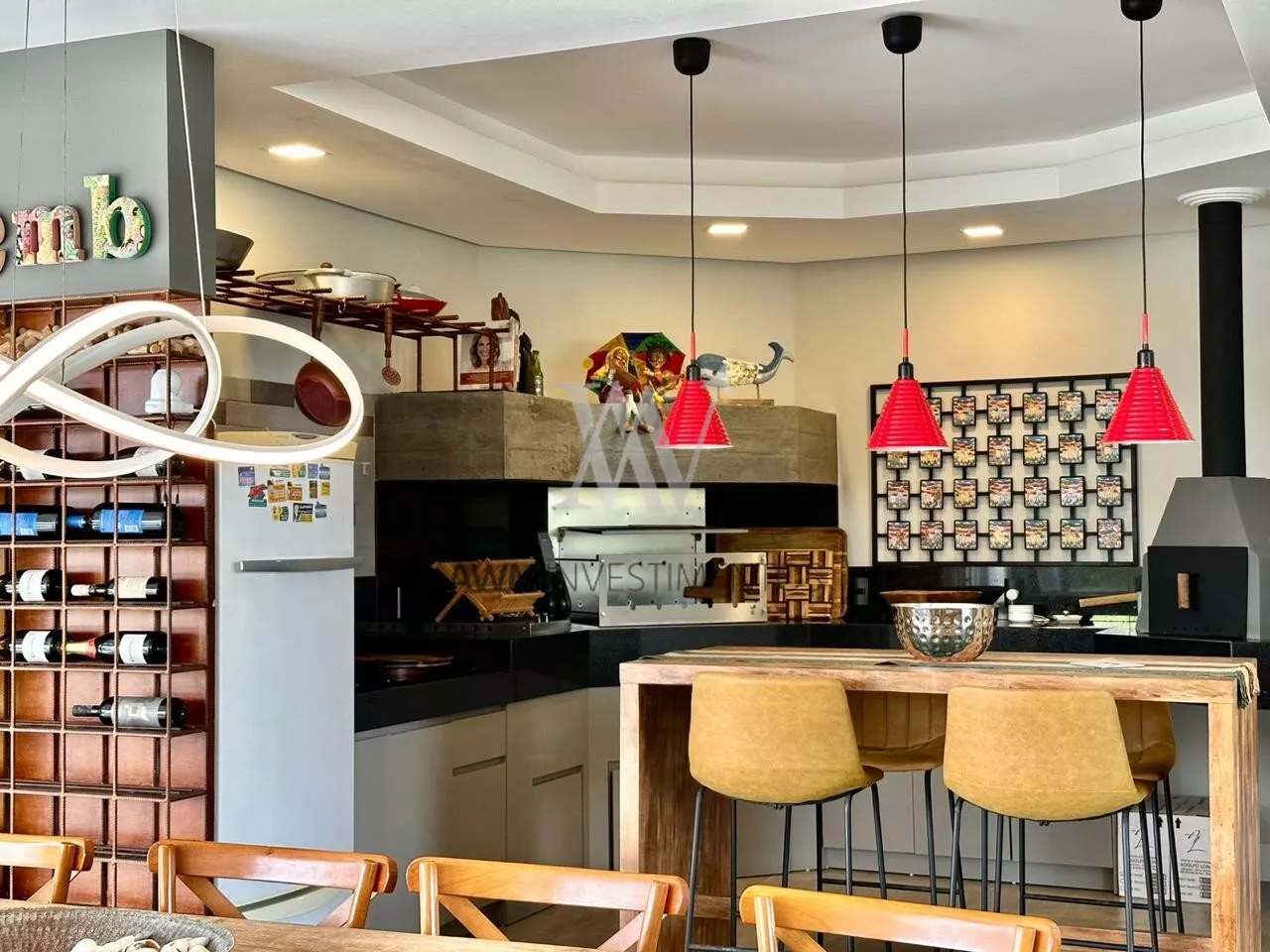 São 570m² de área construída, no primeiro pavimento amplo living para 5 ambientes, com cozinha americana, e cozinha fechada (portas de correr) churrasqueira e forno de pizza, lareira e lavabo. 1 suíte com closet e duas cubas (com acessibilidade). Área externa com pergolado, piscina com área gourmet, choperia e churrasqueira. Depósito e garagem fechada para 4 carros.