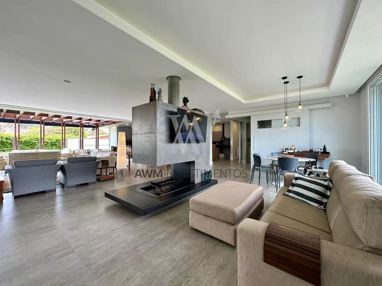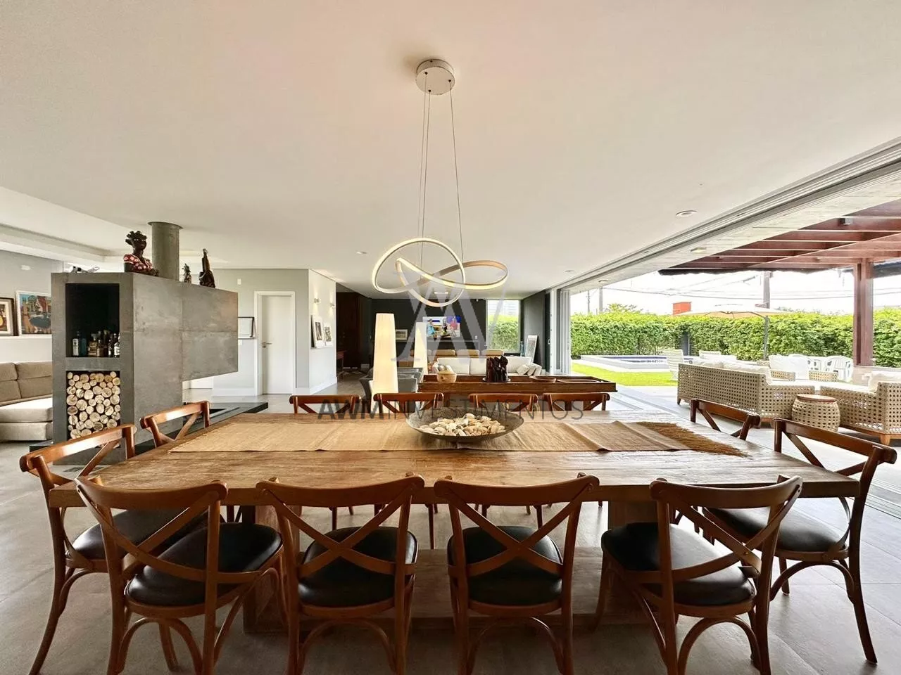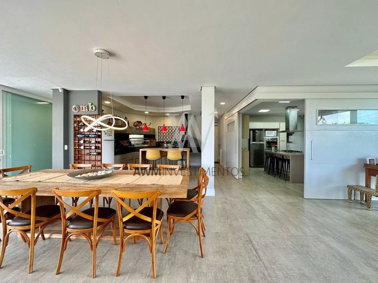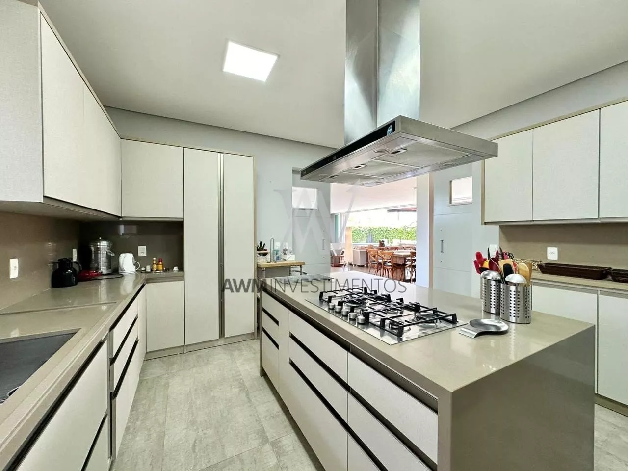 São 570m² de área construída, no primeiro pavimento amplo living para 5 ambientes, com cozinha americana, e cozinha fechada (portas de correr) churrasqueira e forno de pizza, lareira e lavabo. 1 suíte com closet e duas cubas (com acessibilidade). Área externa com pergolado, piscina com área gourmet, choperia e churrasqueira. Depósito e garagem fechada para 4 carros.