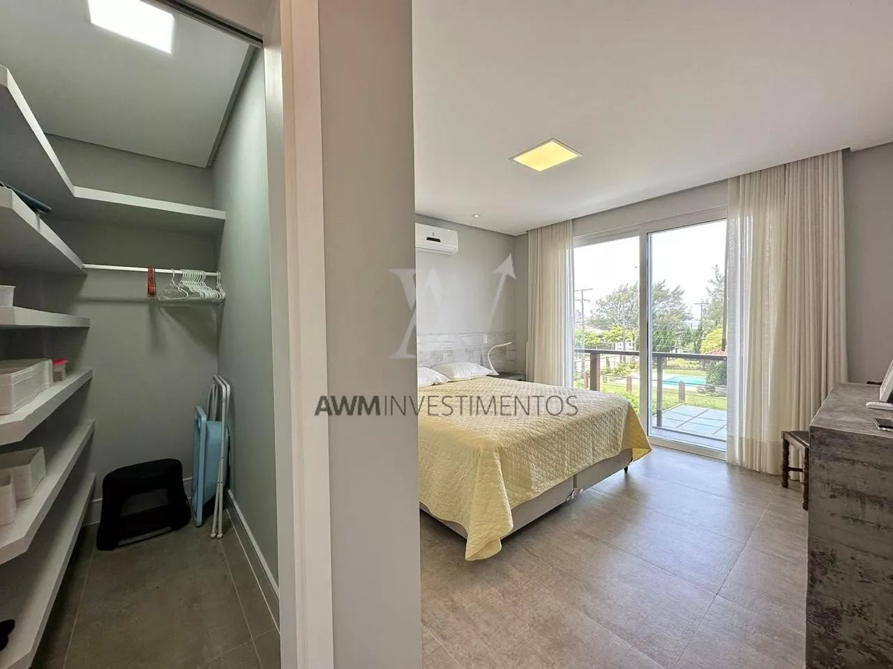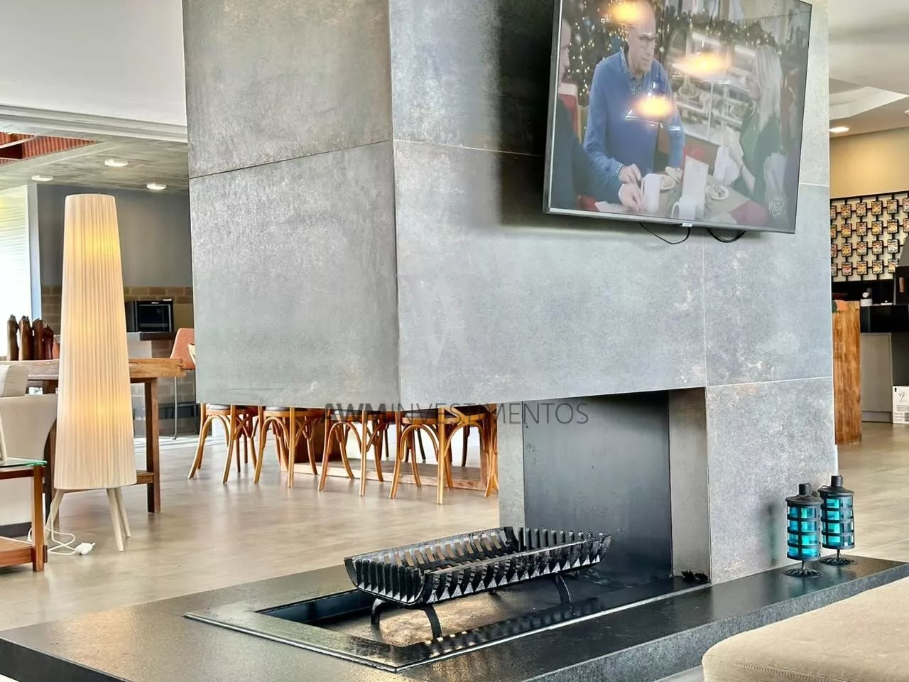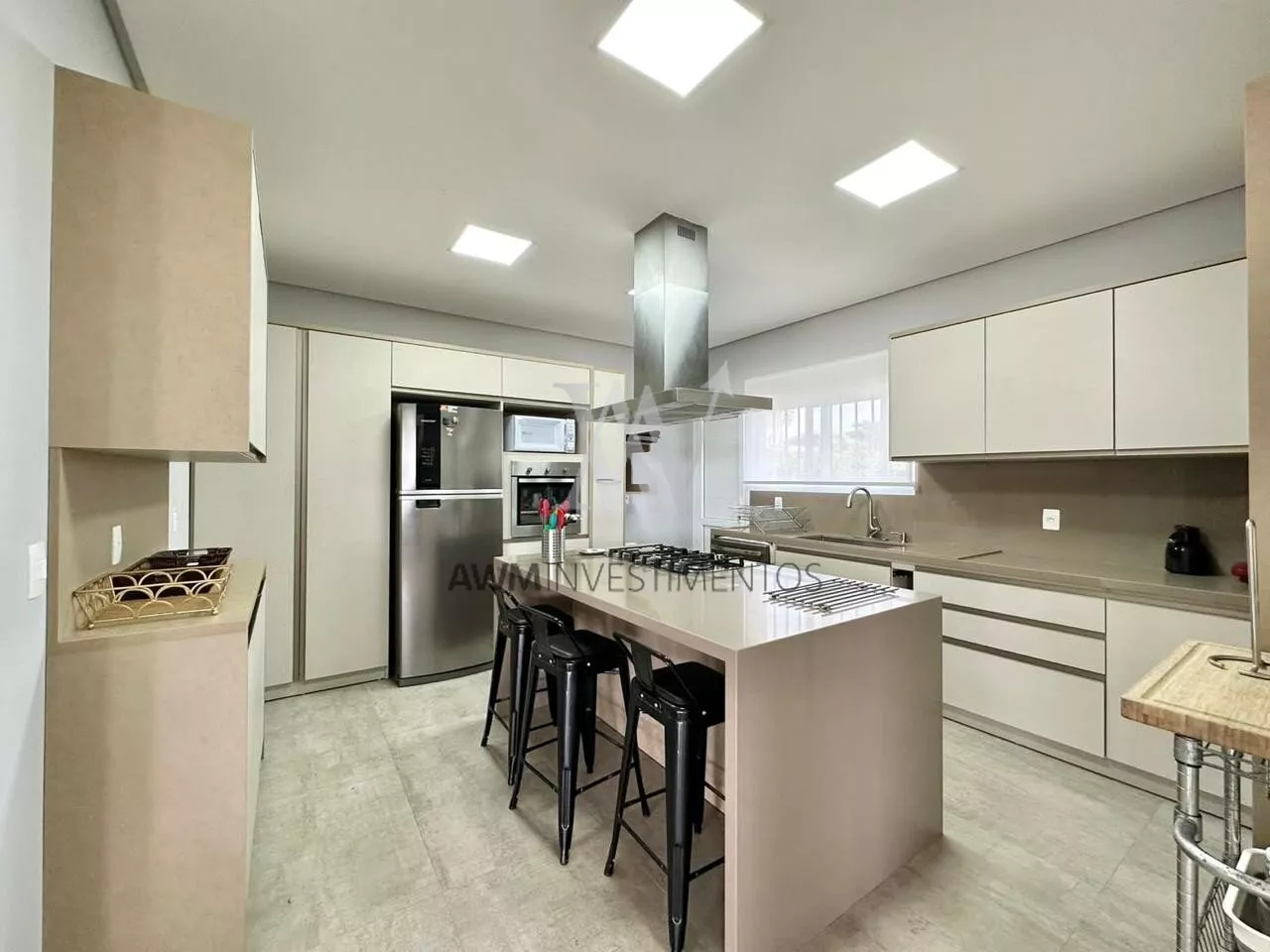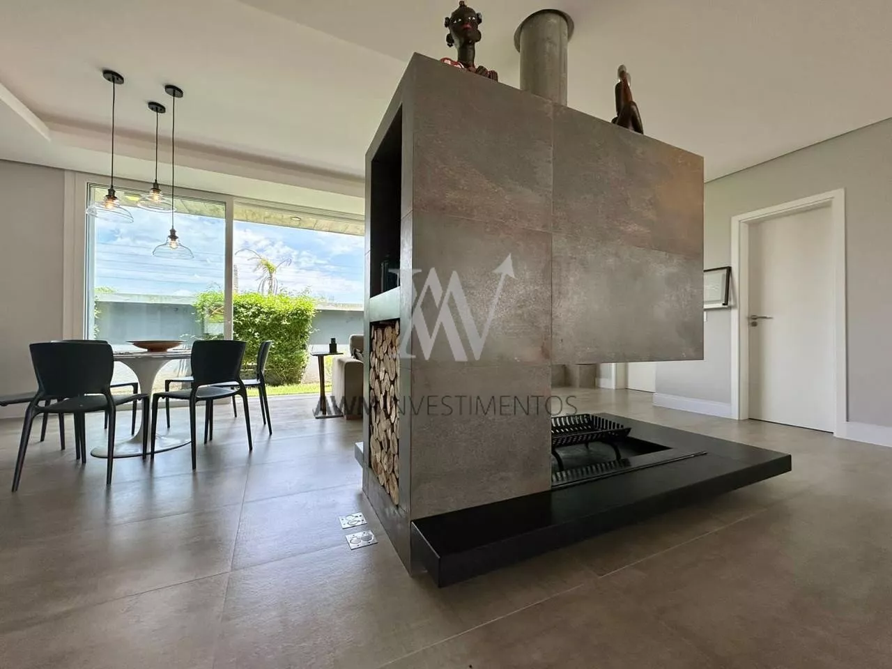 São 570m² de área construída, no primeiro pavimento amplo living para 5 ambientes, com cozinha americana, e cozinha fechada (portas de correr) churrasqueira e forno de pizza, lareira e lavabo. 1 suíte com closet e duas cubas (com acessibilidade). Área externa com pergolado, piscina com área gourmet, choperia e churrasqueira. Depósito e garagem fechada para 4 carros.