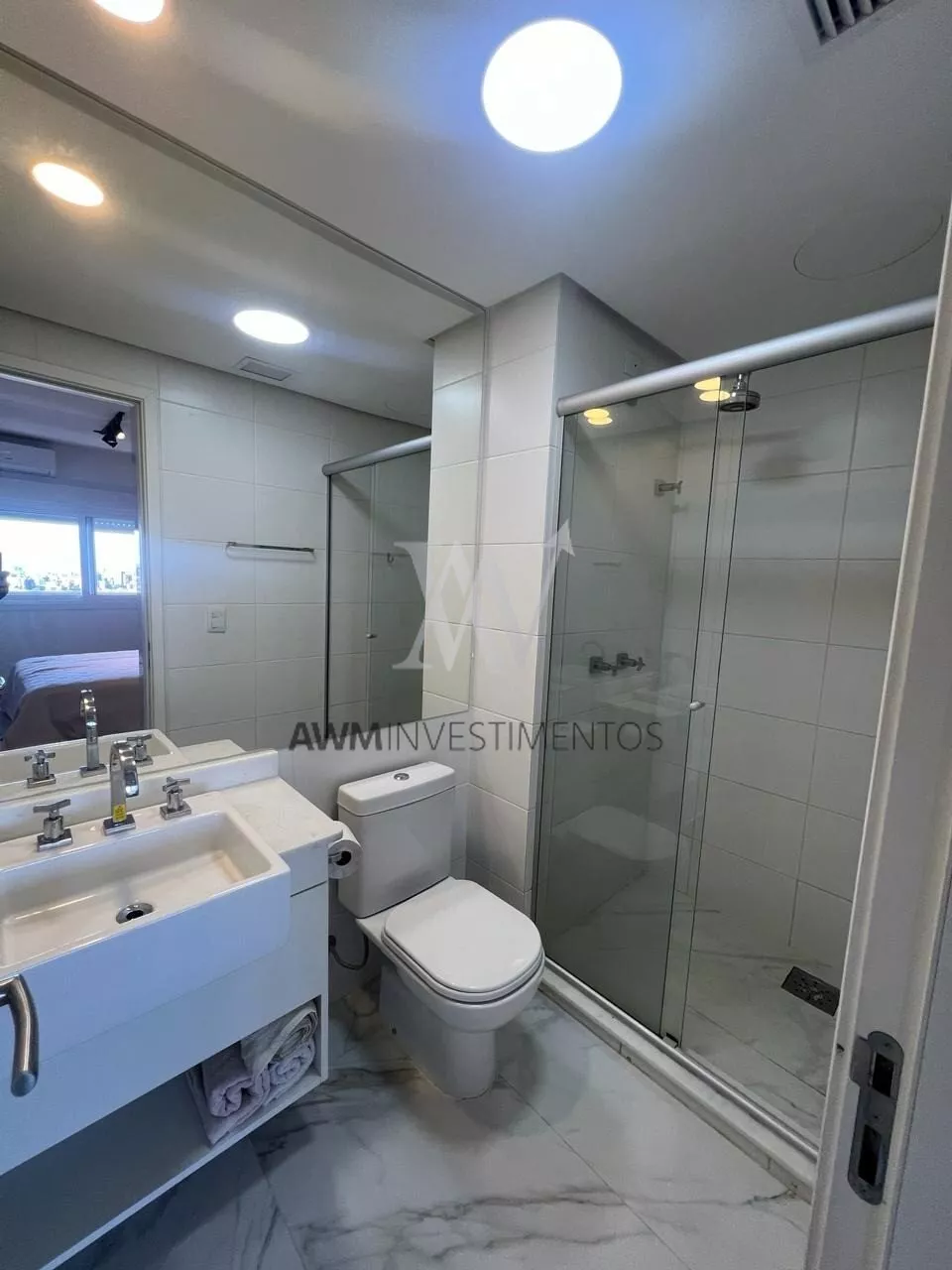 Um diferencial importante neste apartamento é a suíte com guarda-roupas piso teto e no banheiro box de vidro e pia sobreposta na bancada de pedra natural.