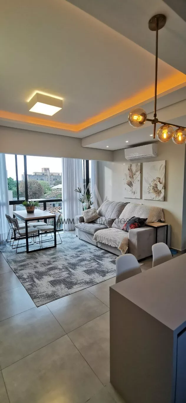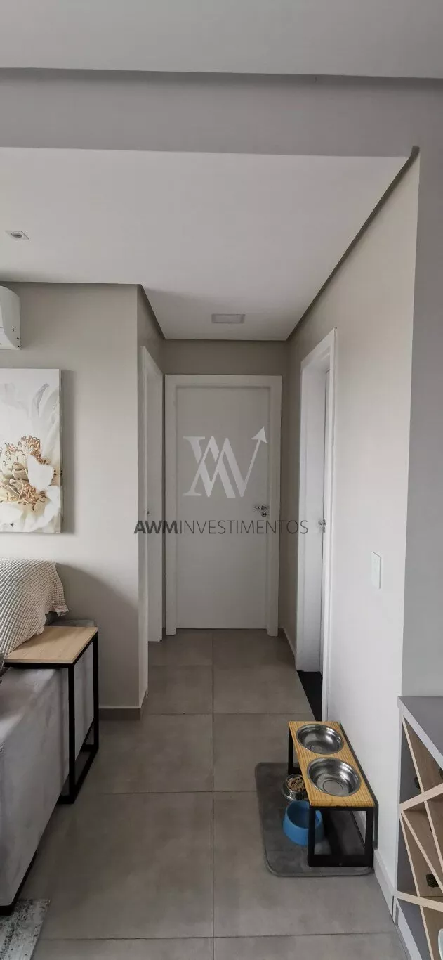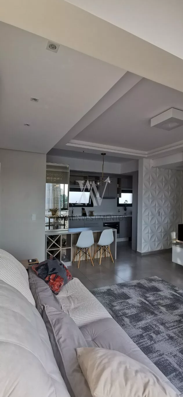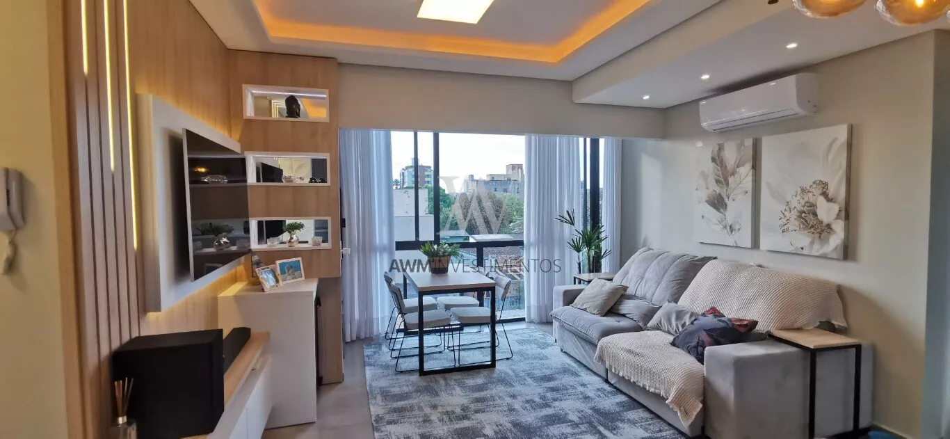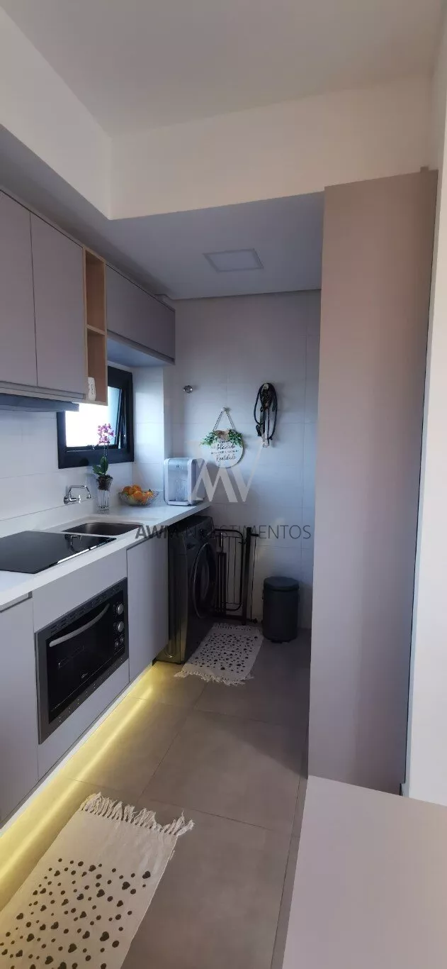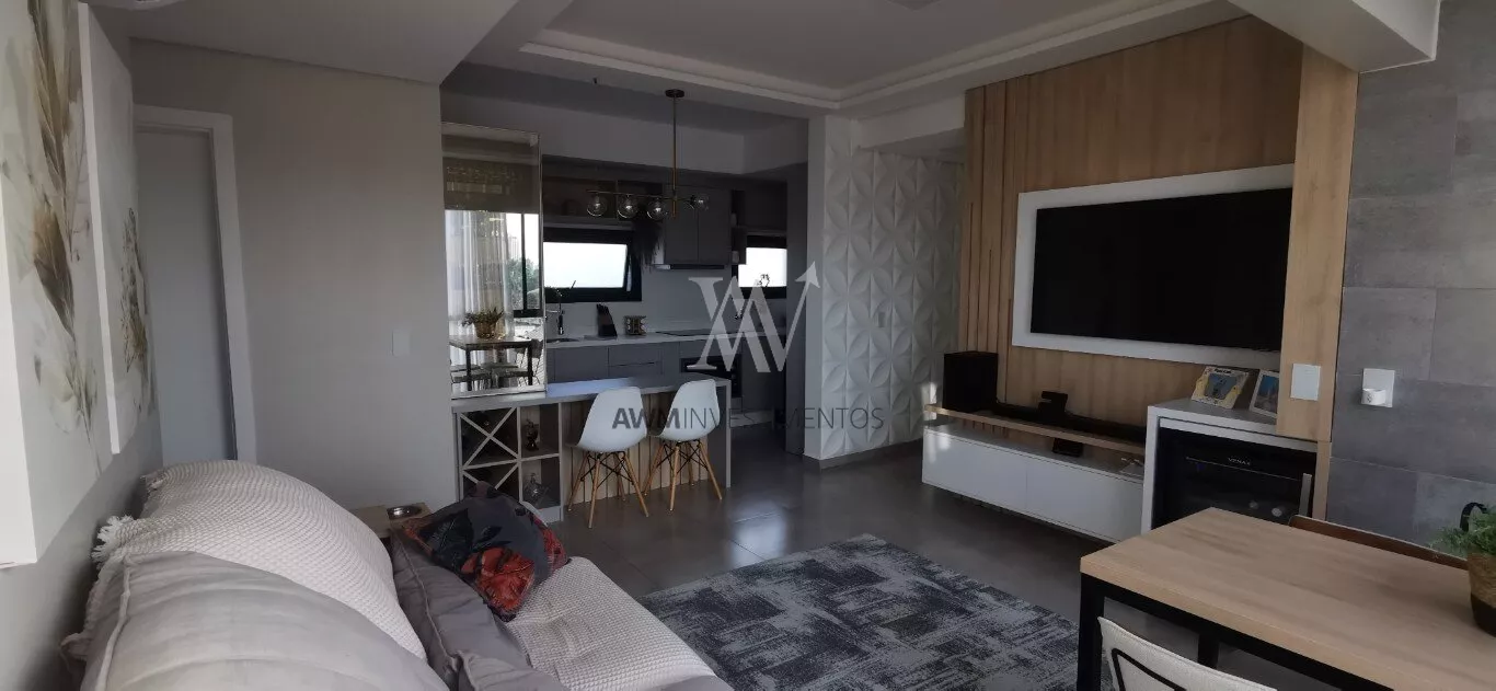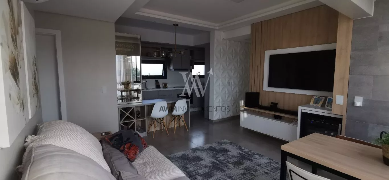 Awm Vende apartamento com dois dormitórios, semi mobiliado, sala de estar e jantar integradas, cozinha americana , piso porcelanato, sacada com churrasqueira, 1 vaga de garagem coberta, rebaixamento em gesso, paredes com detalhes 3D.