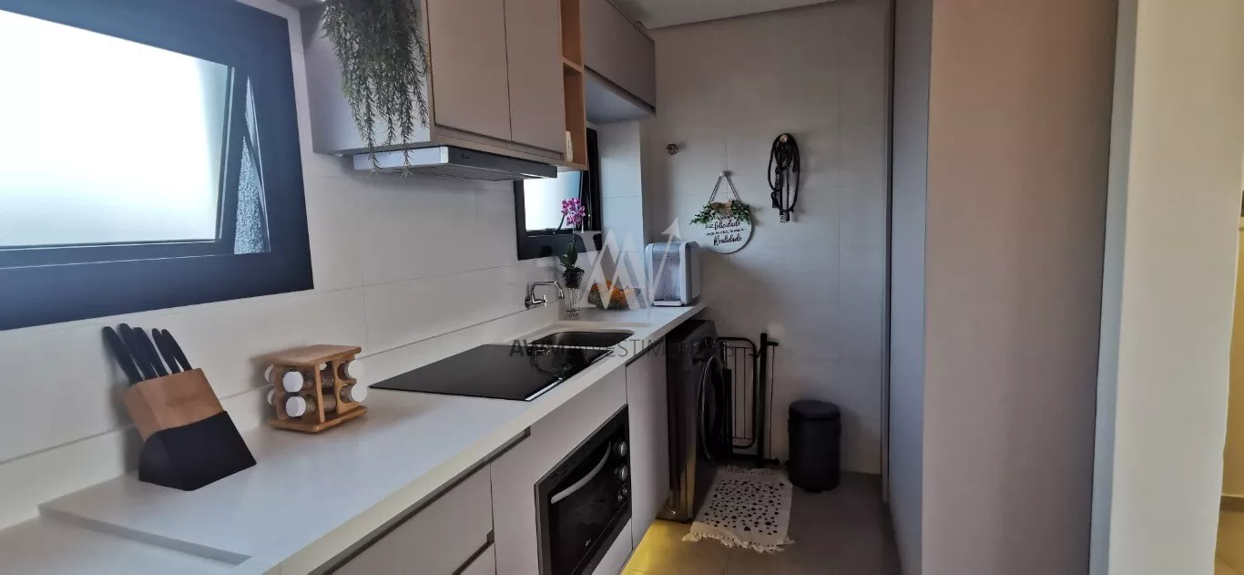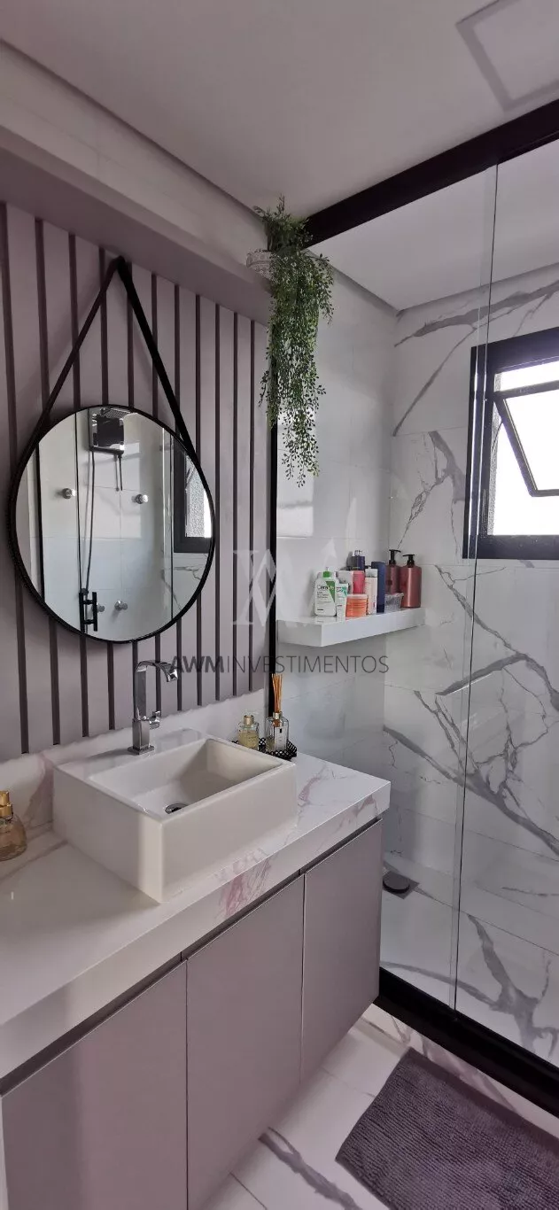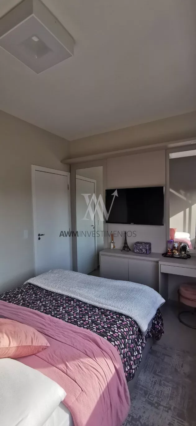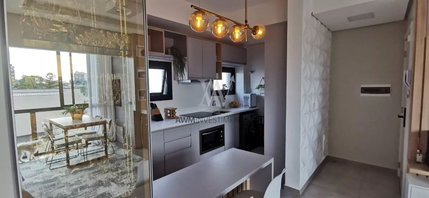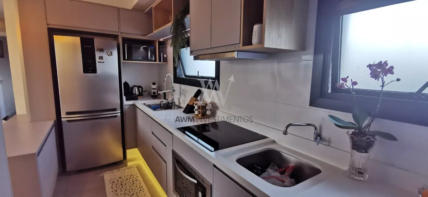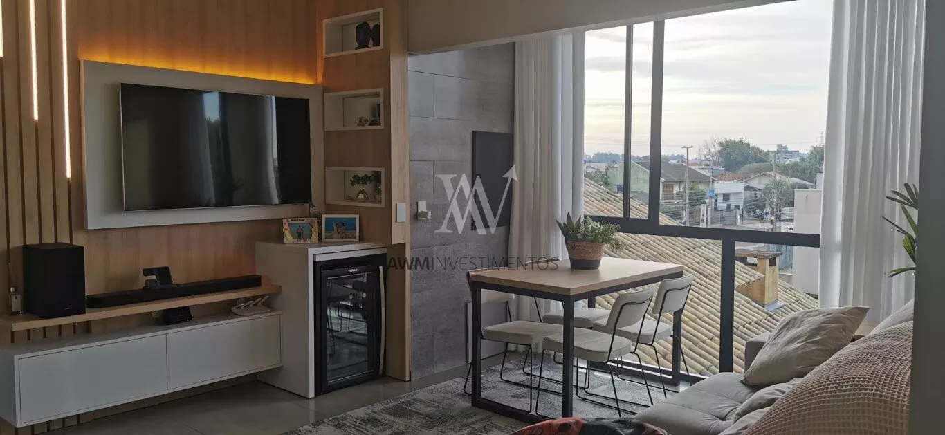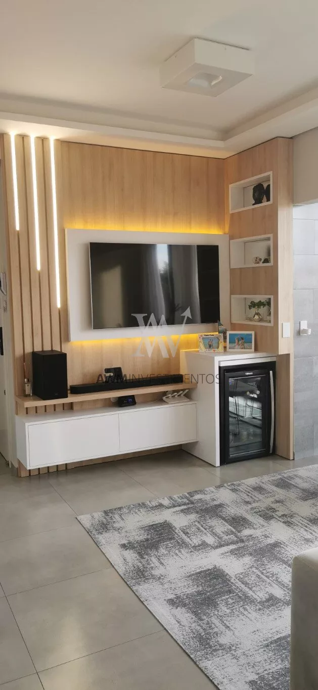 Awm Vende apartamento com dois dormitórios, semi mobiliado, sala de estar e jantar integradas, cozinha americana , piso porcelanato, sacada com churrasqueira, 1 vaga de garagem coberta, rebaixamento em gesso, paredes com detalhes 3D.