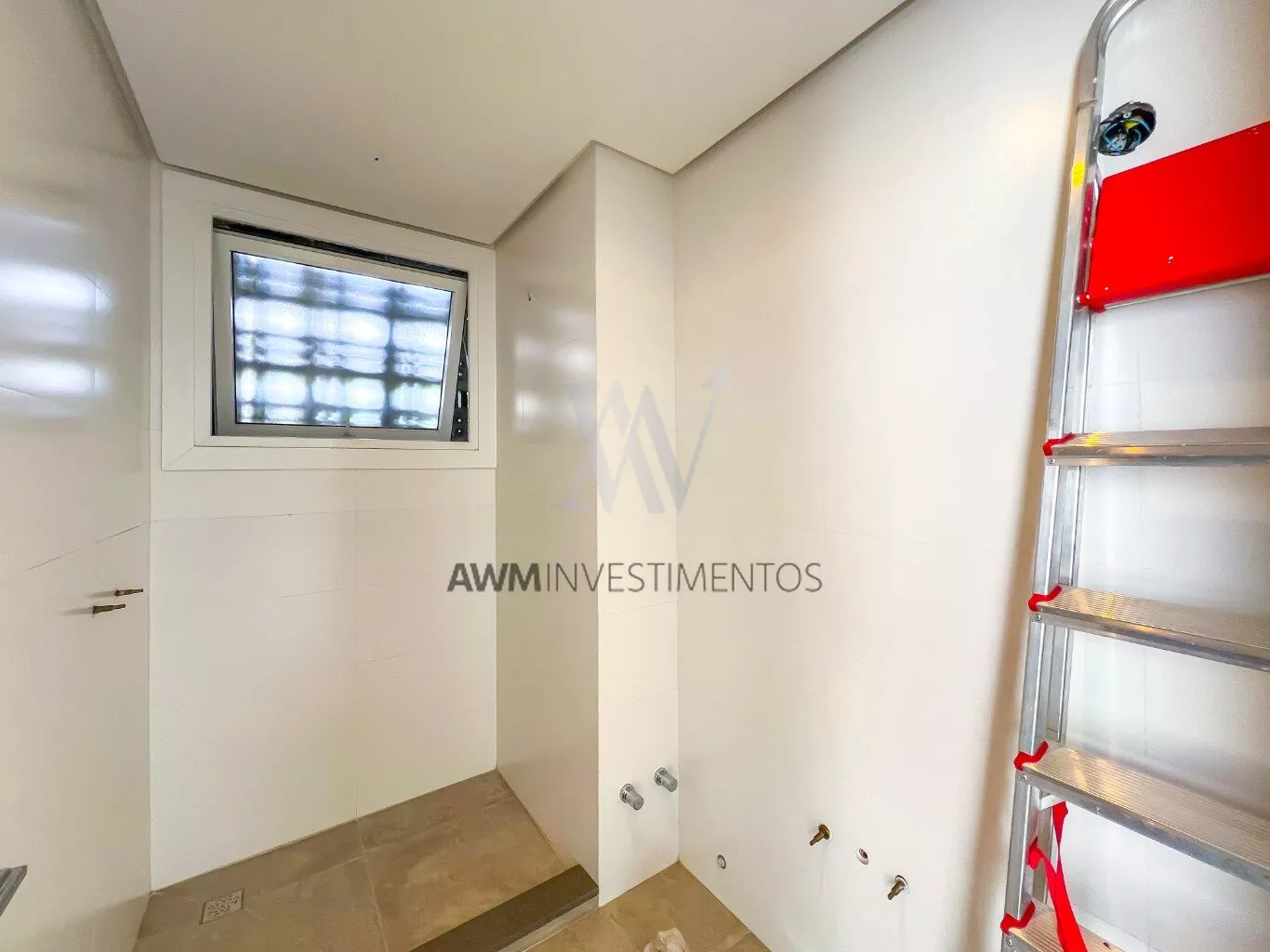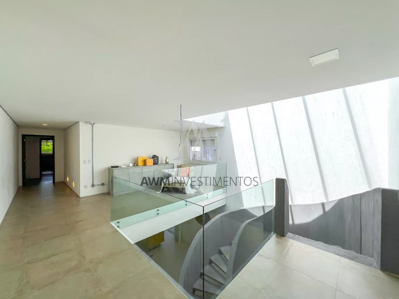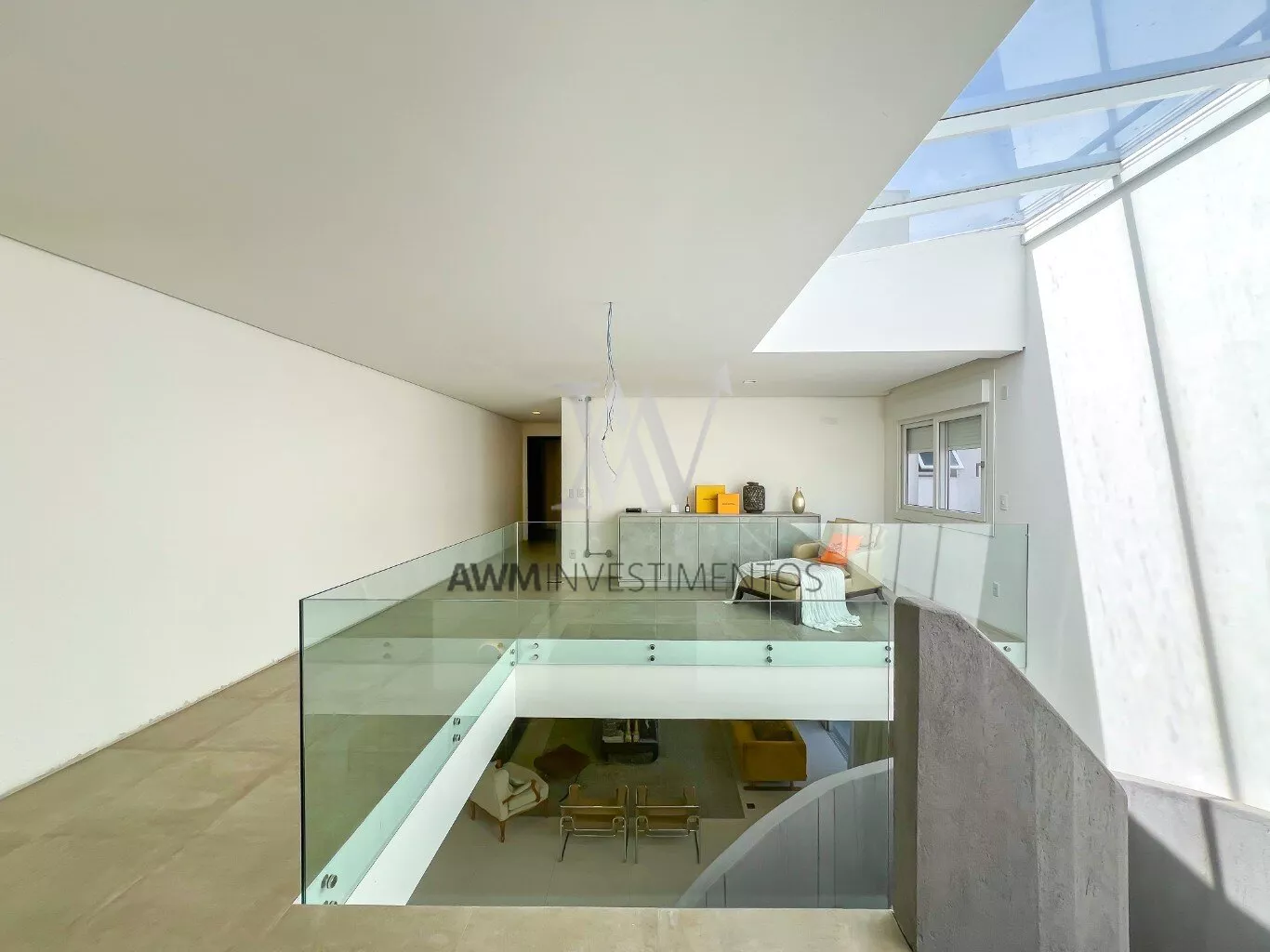 Para acessar o andar superior subimos uma escada super moderna toda em concreto aparente e acessamos a área íntima com 03 dormitórios, 02 suítes com sacada, gabinete podendo ser um 4º dormitório e banheiro social.