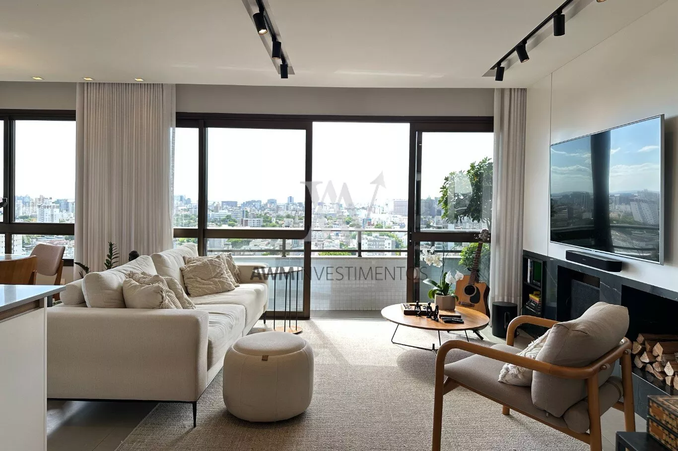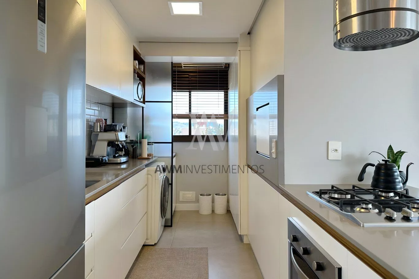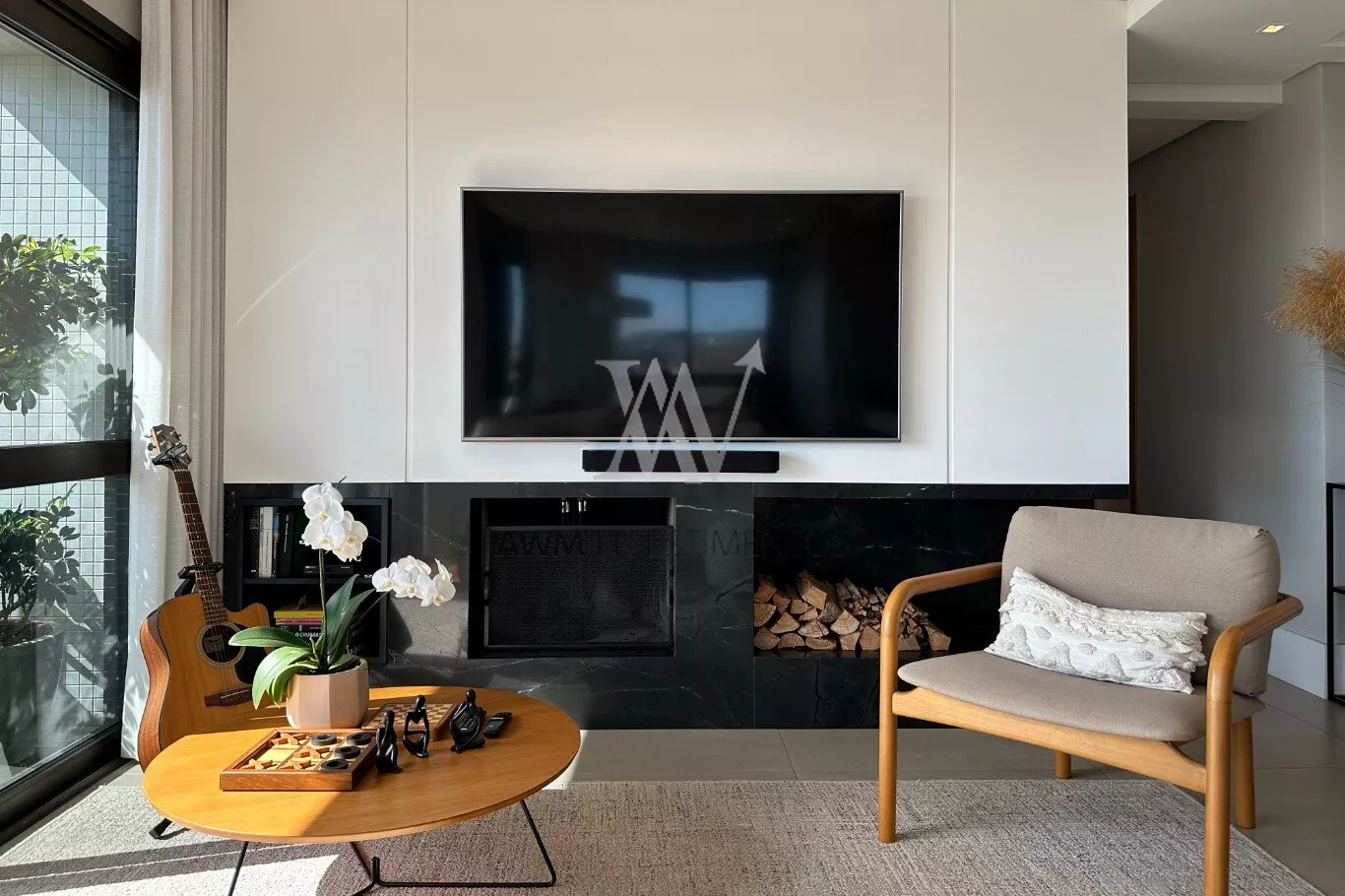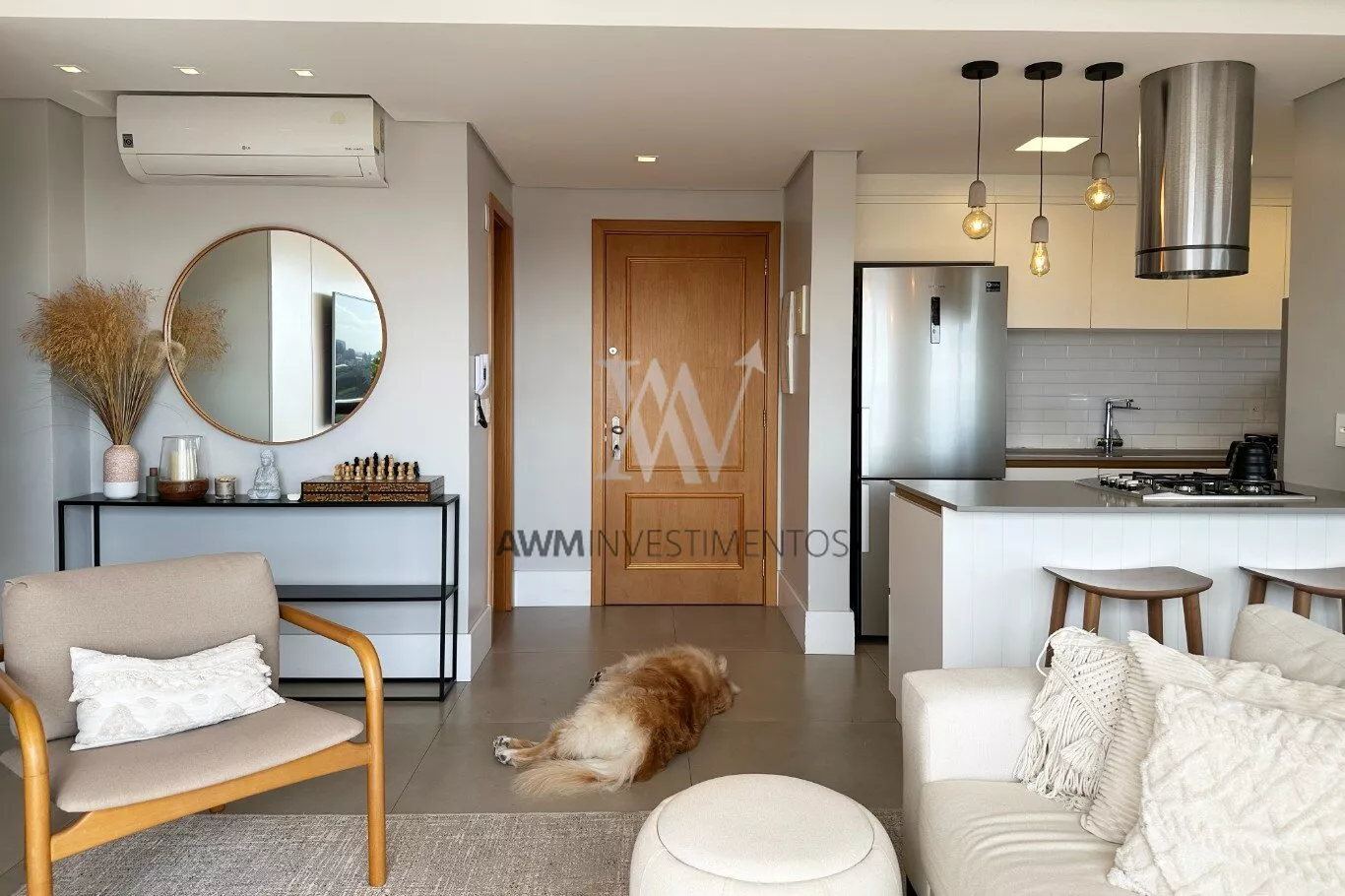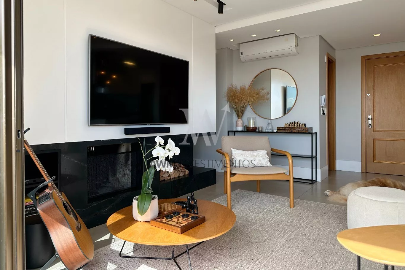 Awm Vende Belíssimo apartamento de 94 m², de frente, finamente decorado por arquiteto, com móveis planejados Todeschini, mesa de jantar Thonart, eletrodomésticos Brastemp e splits já instalados. O living é amplo, com dois ambientes, lareira, lavabo e sacada com vista panorâmica, oferecendo um espaço acolhedor e sofisticado.