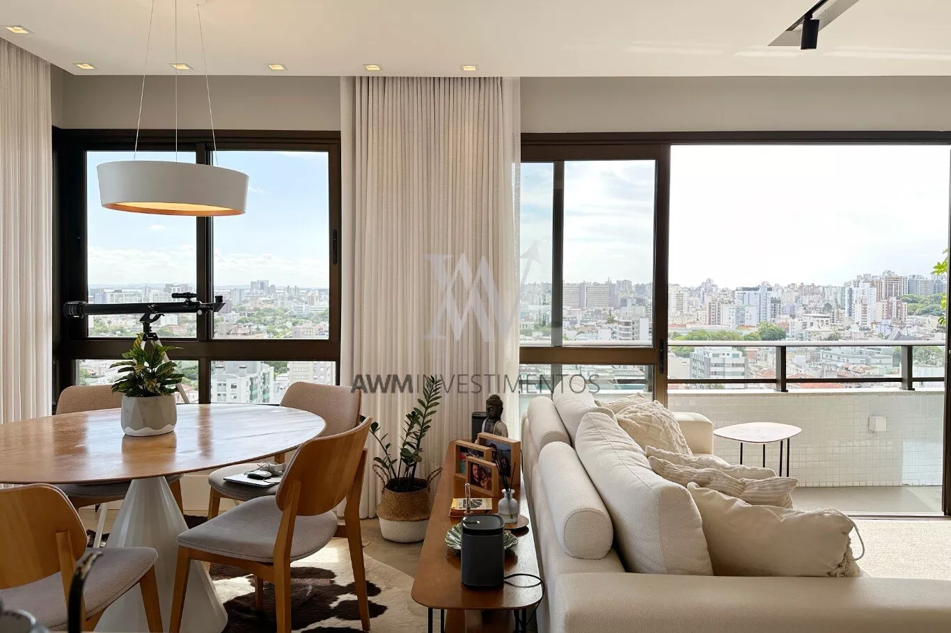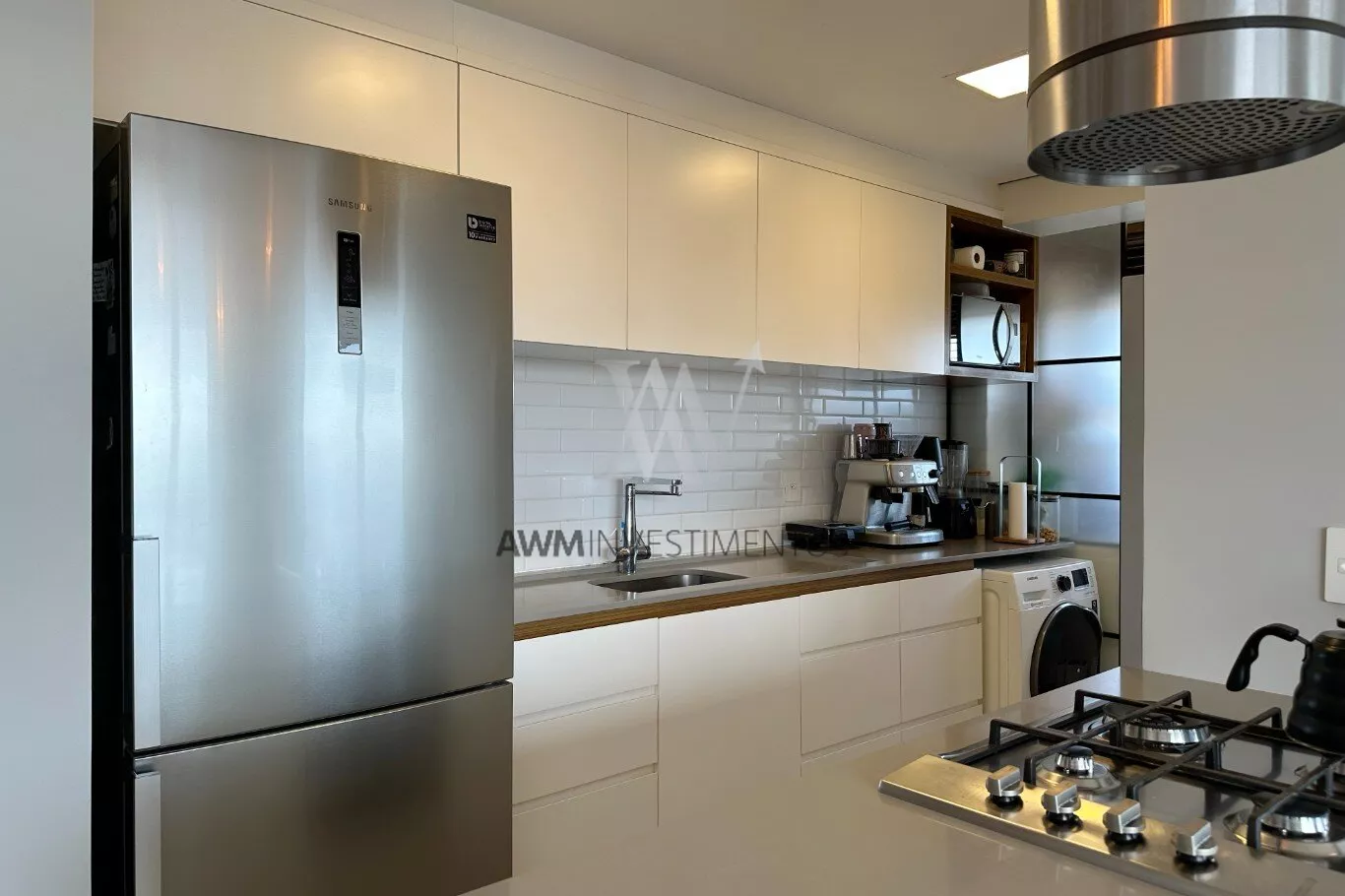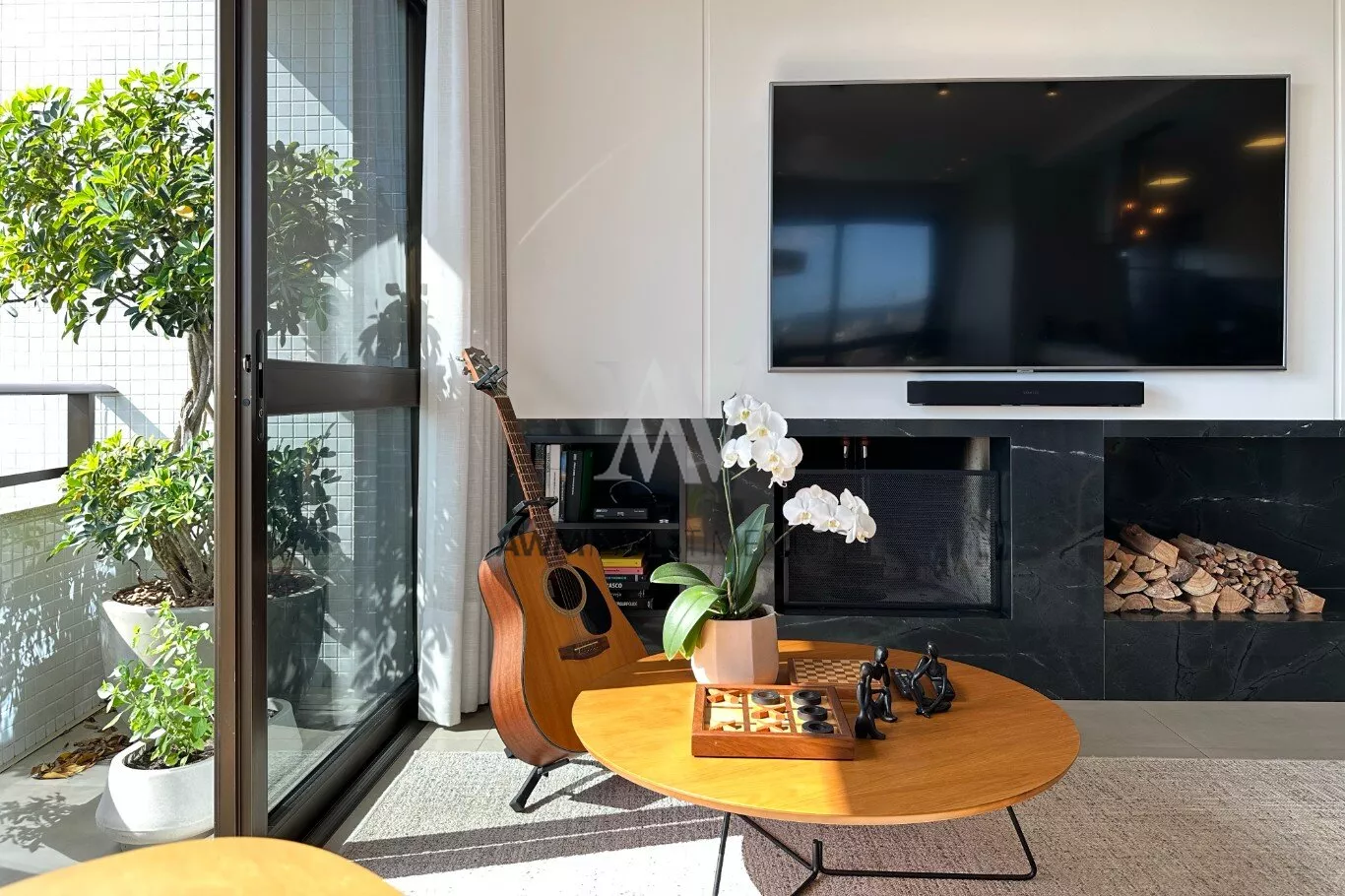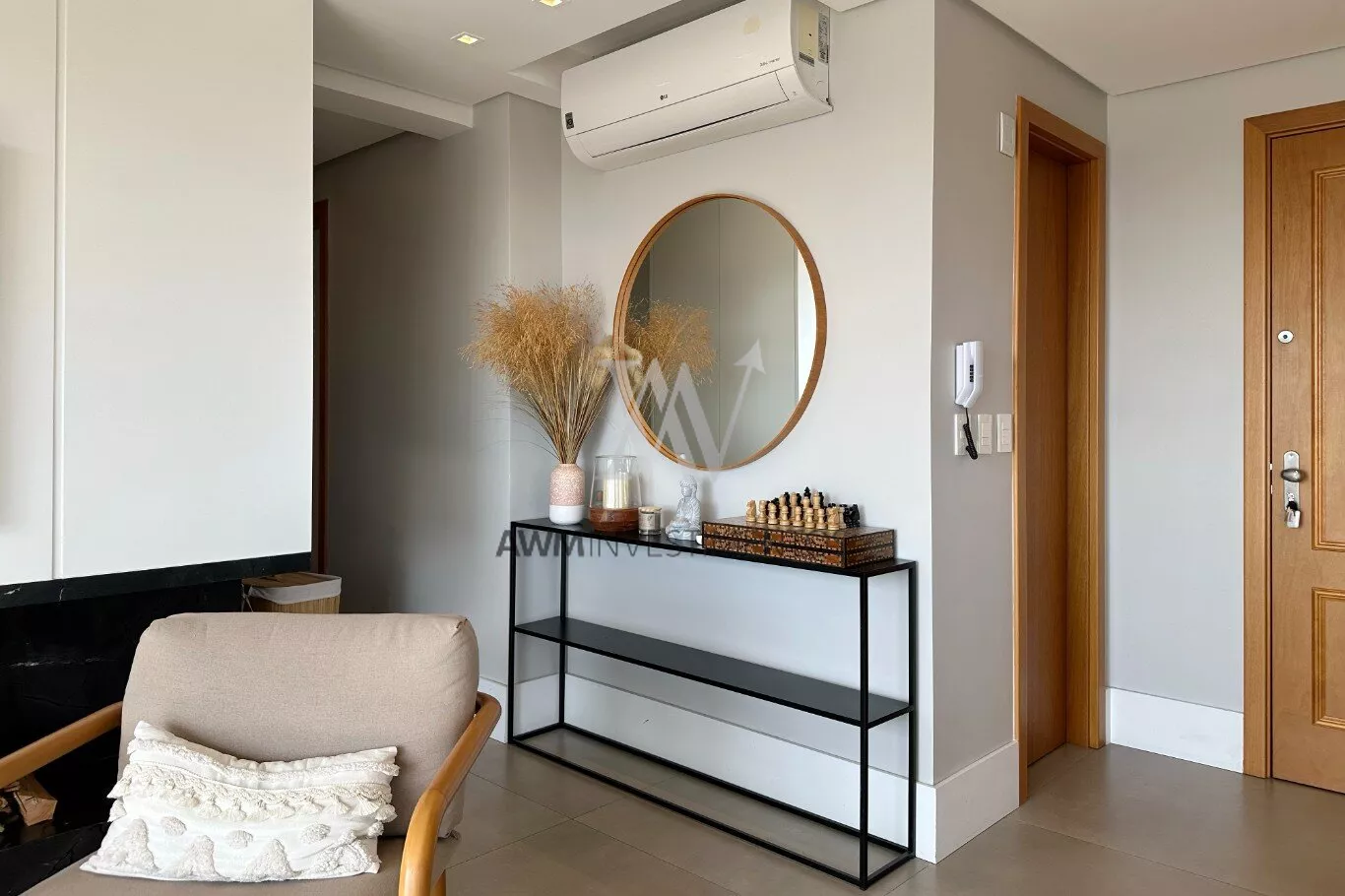 Awm Vende Belíssimo apartamento de 94 m², de frente, finamente decorado por arquiteto, com móveis planejados Todeschini, mesa de jantar Thonart, eletrodomésticos Brastemp e splits já instalados. O living é amplo, com dois ambientes, lareira, lavabo e sacada com vista panorâmica, oferecendo um espaço acolhedor e sofisticado.