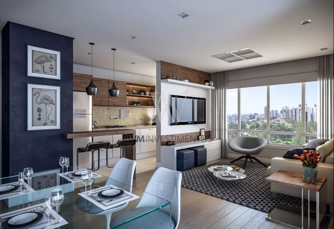 Apartamentos com 2 Dormitórios, sendo 1 Suíte no Dormitório do Casal, Sala de Estar/Jantar, Banheiro Social e Cozinha Americana com Churrasqueira Integrada e área de serviços.