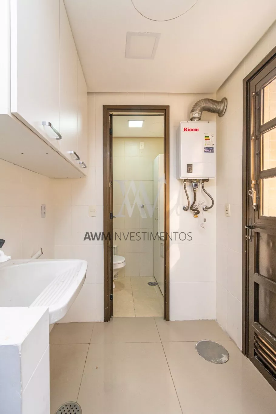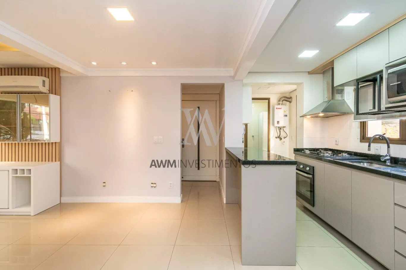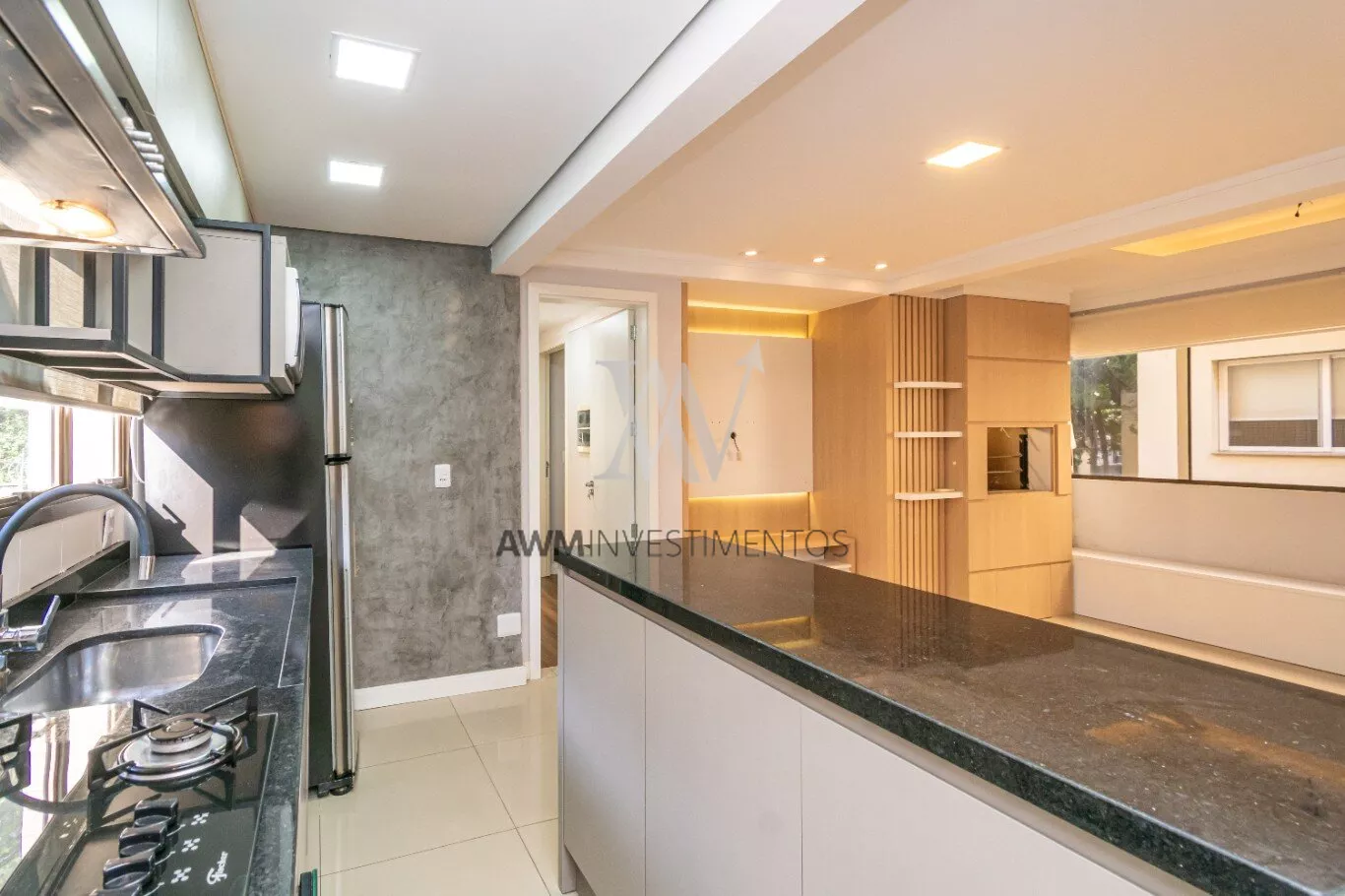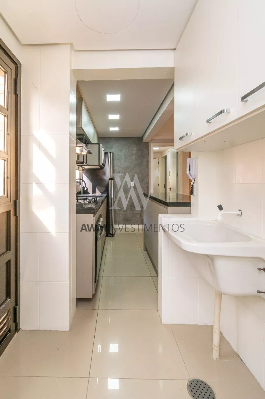 O living, dividido em dois ambientes, integra-se à cozinha americana equipada com móveis sob medida e eletrodomésticos, e à uma churrasqueira. Um lavabo, uma área de serviço funcional e um solário envidraçado, que proporciona excelente luminosidade natural, completam o espaço com charme e praticidade.